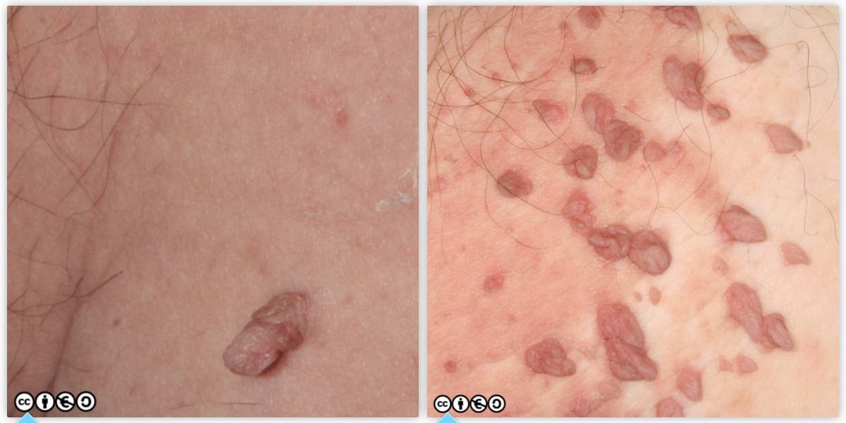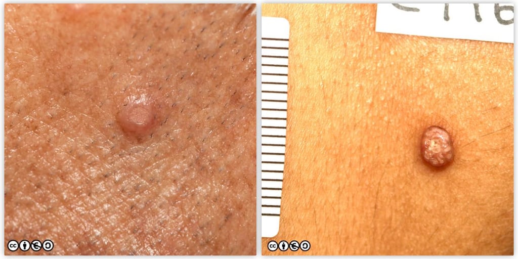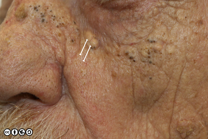 These are clusters of enlarged sebaceous glands most common on the face. They vary in size between 2-6mm. They have a characteristic translucent and yellow colour and an umbilicated or rosette like shape around a central follicular orifice. They are easily confused with small BCCs by the overconfident. They are often multiple.