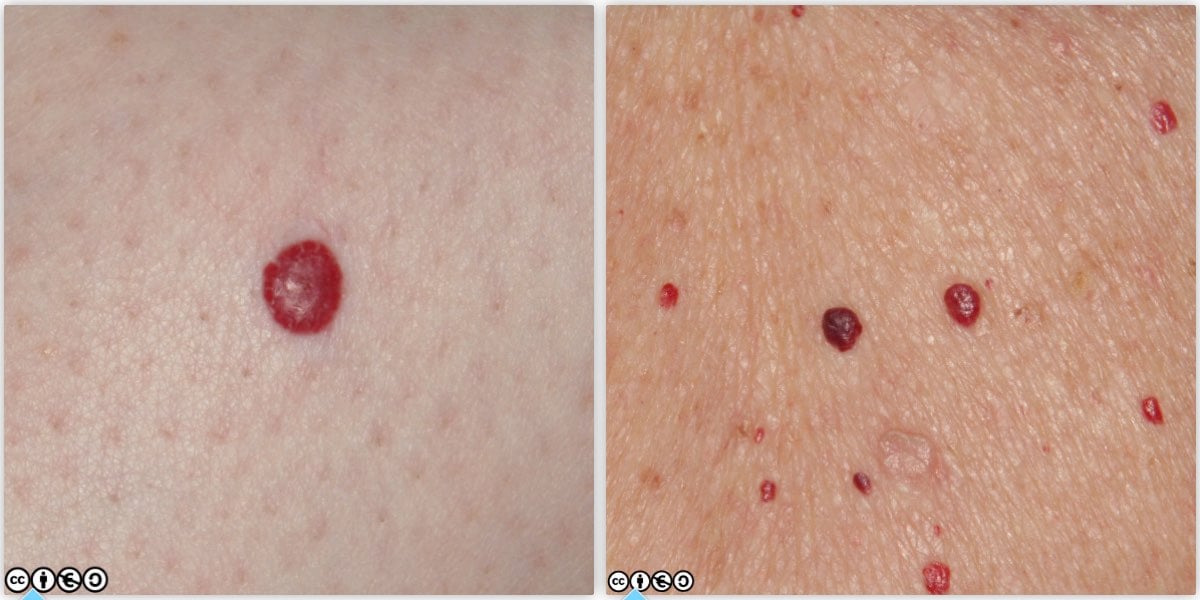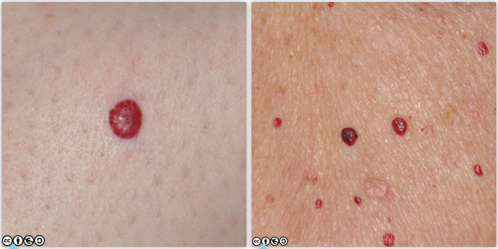 Cherry angiomas (Campbell de Morgan spots) :These are ubiquitous and rarely cause concern (images below).