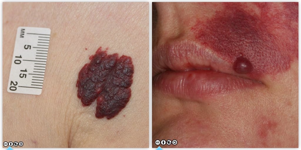 A variety of vascular lesions present at birth or soon after. An example of such a vascular nevus is shown on the left below. On the right there is a port-wine stain, a type of vascular malformation present at birth or shortly afterwards, which become more noticeable over time.