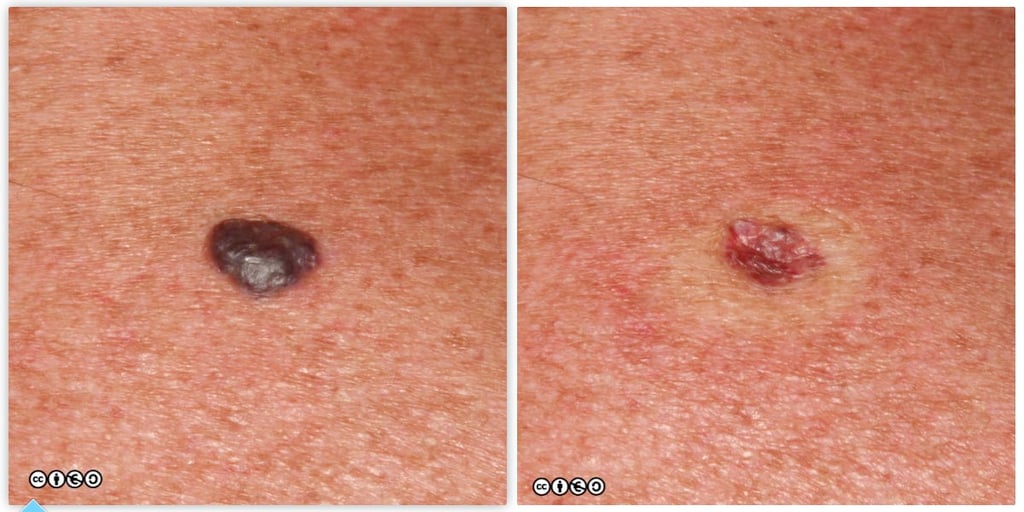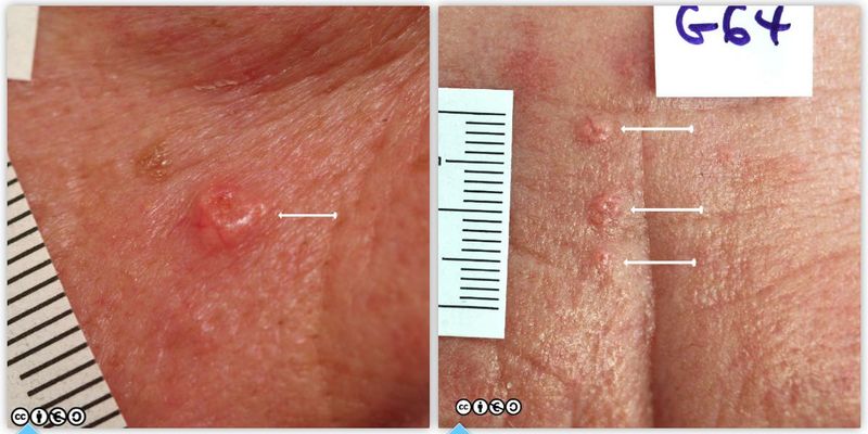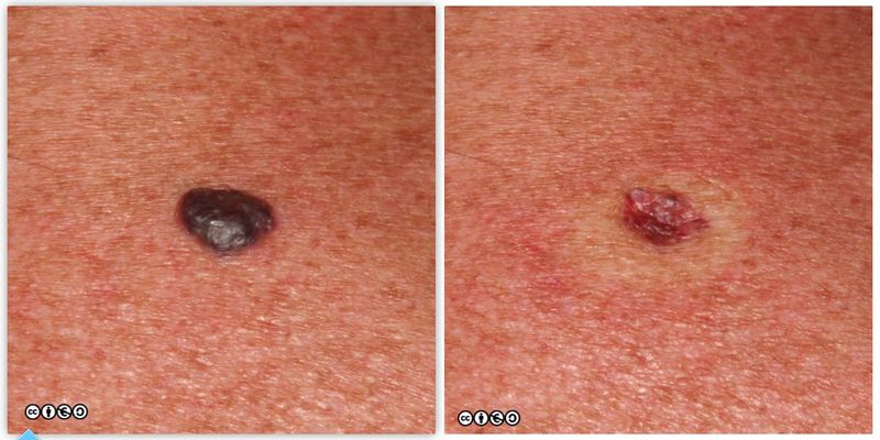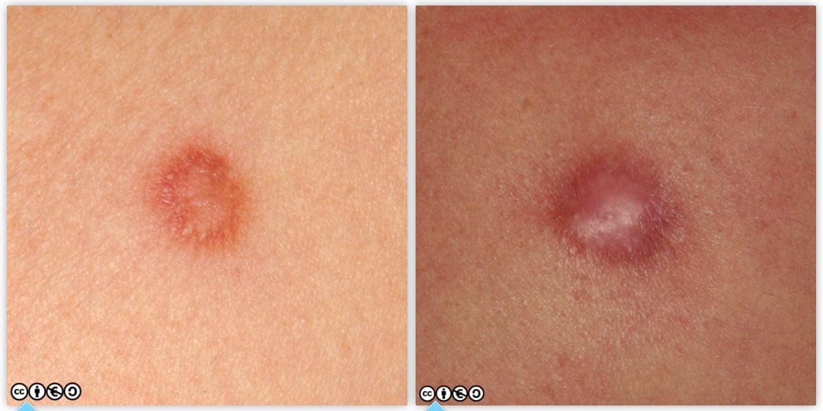 The lesion on the left is before pressure; the lesion on the right, after pressure has been applied. (images below)