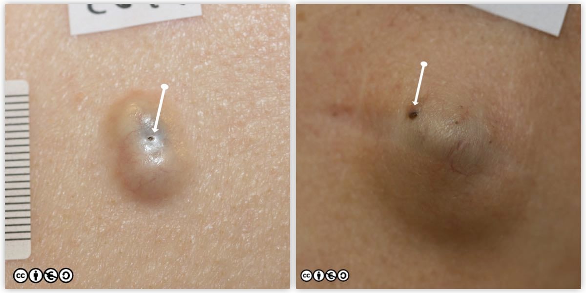 These are wrongly referred to as sebaceous cysts, but they not lined by a sebaceous epithelium, but an epithelium similar to that seen in normal epidermal differentiation. They may contain a punctum — the opening to the surface and remains of the follicular infundibulum that has become obstructed (the assumed mechanism of cyst formation). The punctum is arrowed in the two images below. Note the scar from previous surgery of the one on the right that has recurred.