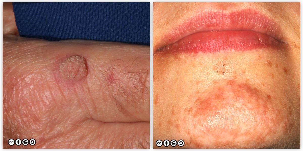 New warts may develop in older persons and can be confused with AKs, seborrhoeic keratoses or even SCCs. Patients who are immunosuppressed are at an increased risk of NMSC and have a much higher prevalence of viral warts. Clinical assessment can be difficult in these patients, and diagnostic suspicion is warranted because a SCC may be misdiagnosed as a benign viral wart. For instance the lesion on the left below is a viral wart but a SCC or a seborrhoeic keratosis comes into the differential. The multiple lesions on the chin of the patient (image on the right below), are plane warts, again due to human papilloma infection. This type of HPV lesion often pigments markedly.