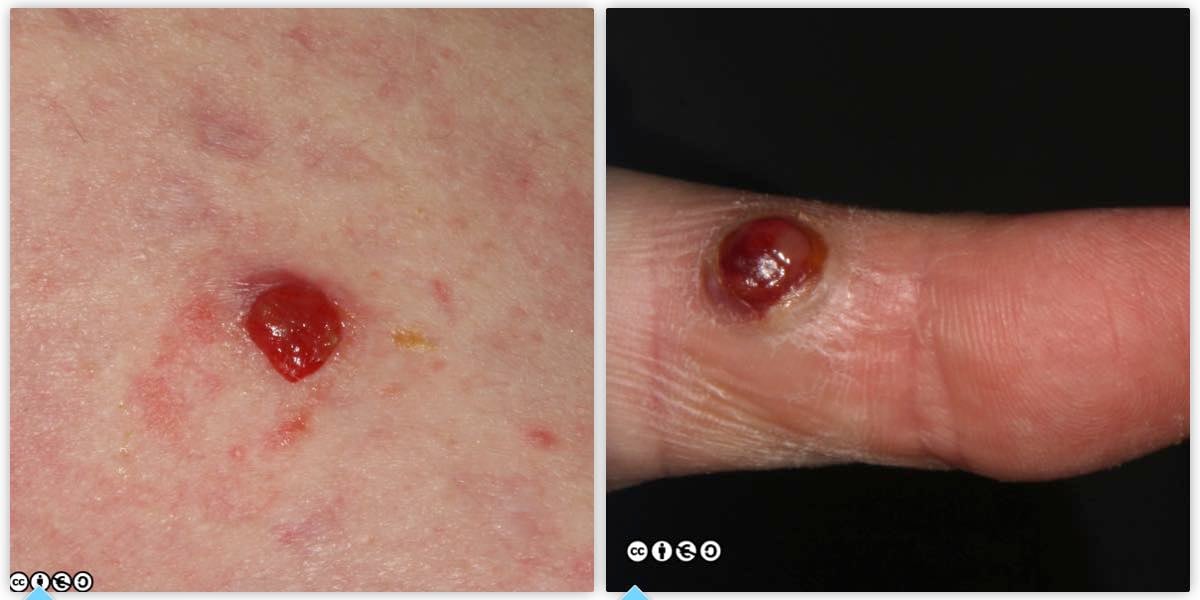 Pyogenic granulomas are best viewed as a vascular proliferation in response to wounding, and are common on the hands and around the mouth. They occur in children, as well as adults. Because they bleed with minimal trauma they are often curetted (or excised). Two examples of pyogenic granulomas are shown below.