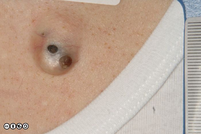 Giant comedones are epidermal cysts with a prominent opening (or more than one) as is visible in the image below. They are still referred for review as suspected melanomas.