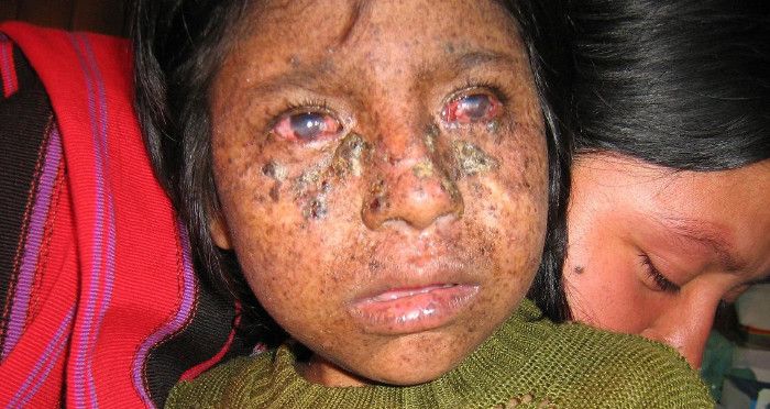 So how might we prove the relation between DNA damage and erythema is causal? As so often in medicine, insight comes from the close study of patients with a particular disease. In this instance, the disease is xeroderma pigmentosa (OMIM #278700). The image below shows a child with xeroderma pigmentosum.