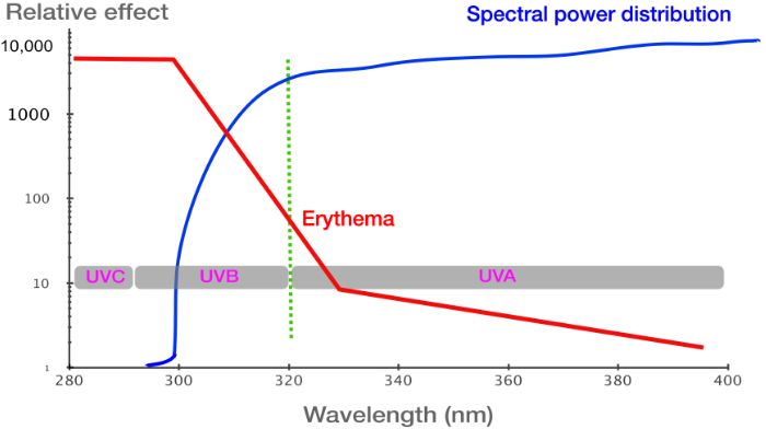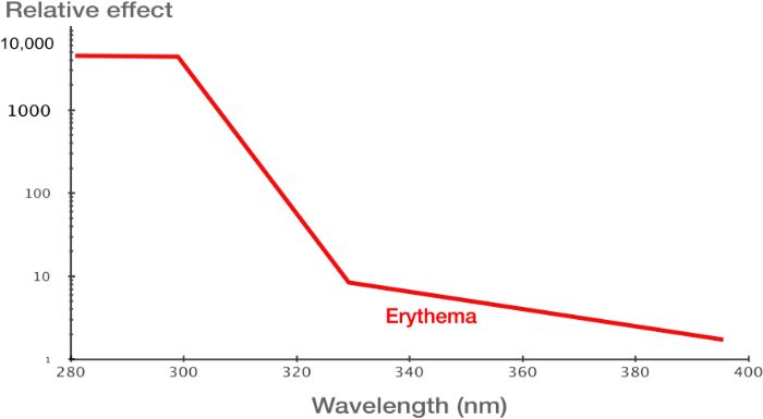 This sort of representation, linking some output (e.g. erythema) with wavelength is known as an action spectrum. What is shown above is the action spectrum for erythema.