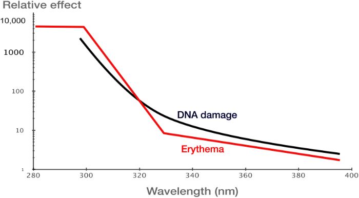 The figure below shows the ability of ultraviolet radiation of various wavelengths to induce erythema in human skin. The ‘X’ axis refers to the wavelength of ultraviolet radiation in nanometres, and the ‘Y’ axis the amount of erythema or DNA damage. Note that the ‘Y’ axis is on a logarithmic scale, spanning at least three orders of magnitude.